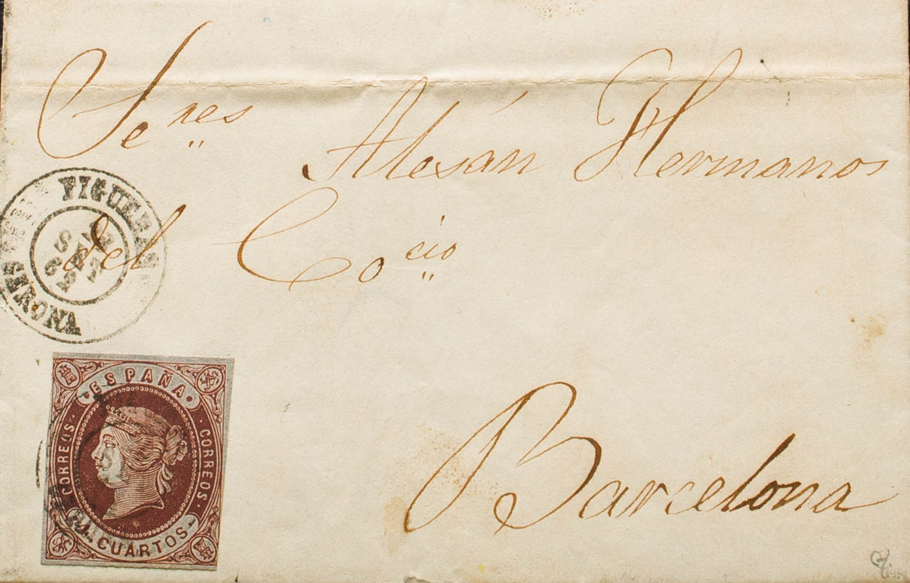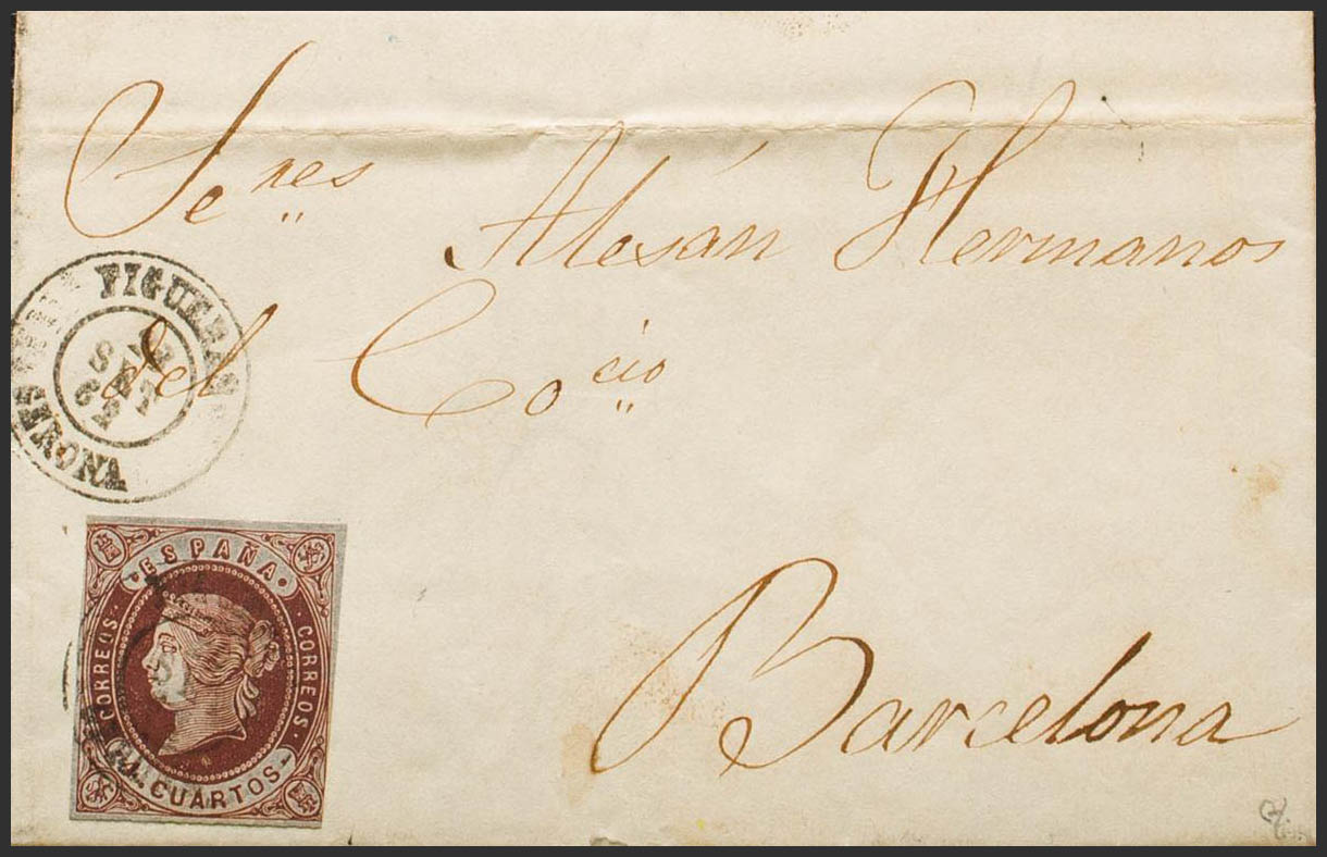 58. 1862. 4 cuartos castaño. FIGUERAS a BARCELONA. Matasello FIGUERAS / GERONA. MAGNIFICA. Ex-Tizón.