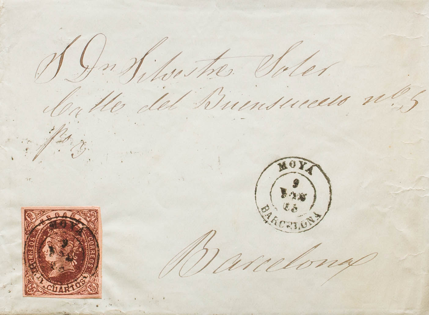 58. 1863. 4 cuartos castaño. ESTANY a BARCELONA. Matasello MOYA / BARCELONA. MAGNIFICA Y RARA. Ex-Tizón.