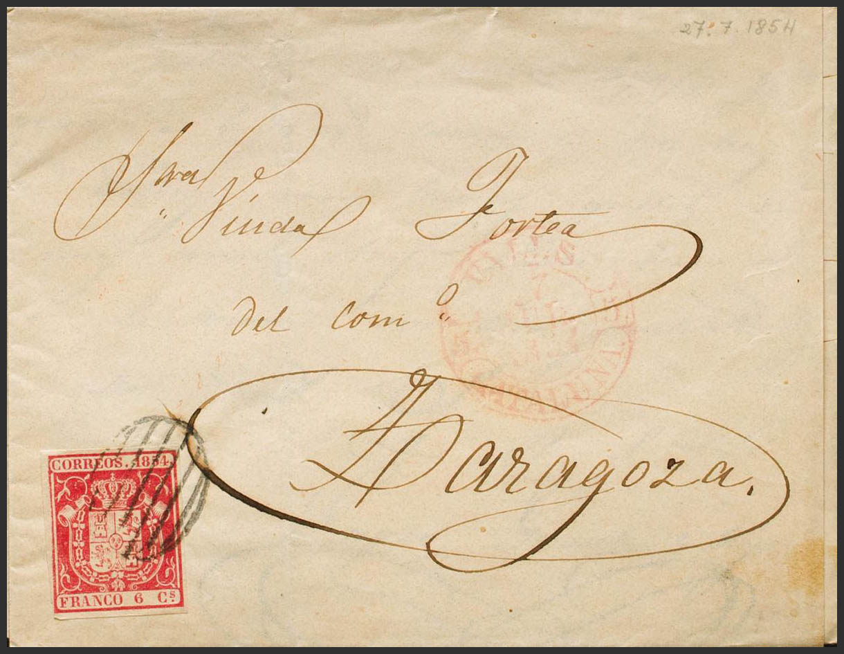 24. 1854. 4 cuartos carmÃn. VALLS a ZARAGOZA. En el frente baeza VALLS / CATALUÑA. MAGNIFICA. Ex-Tizón.