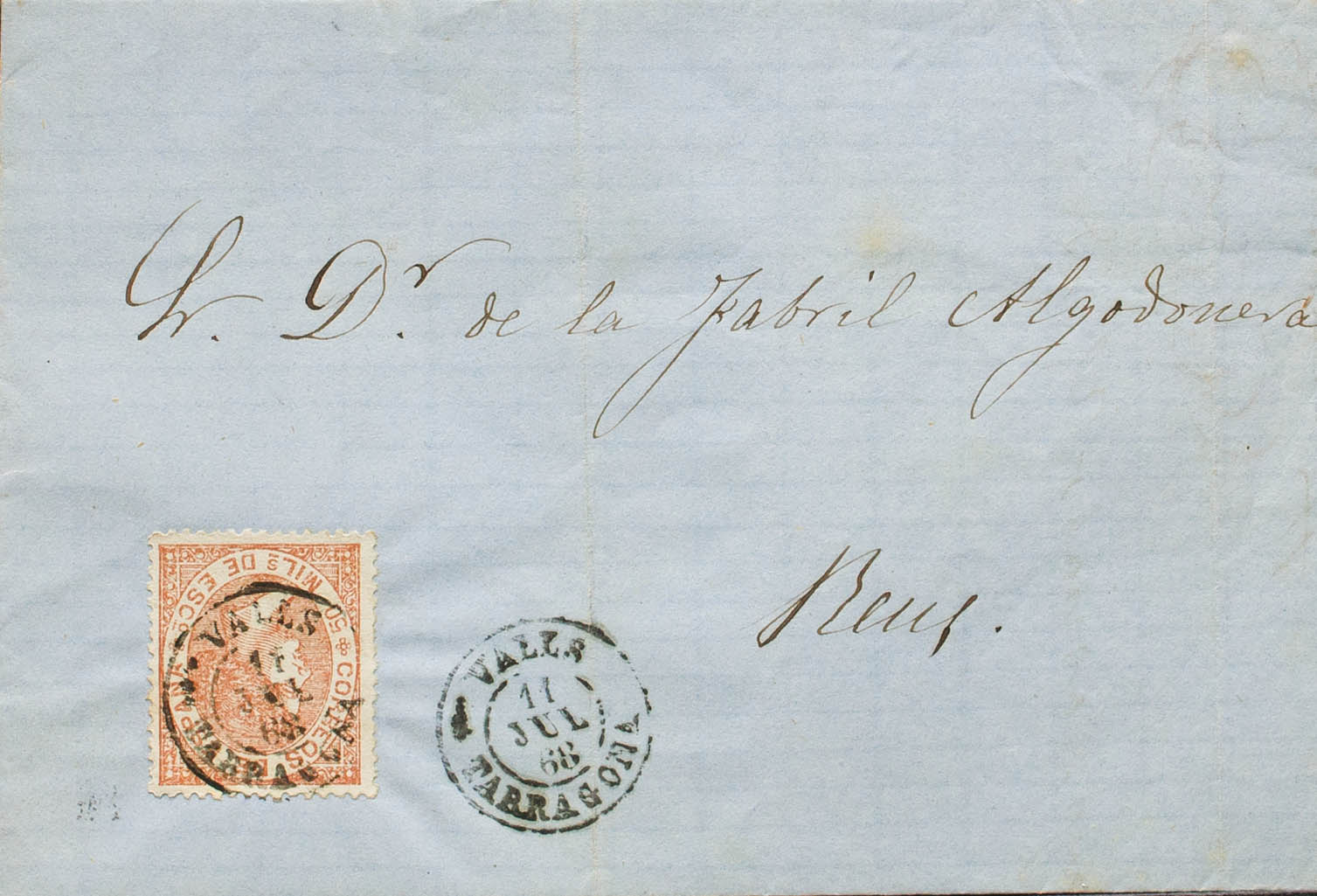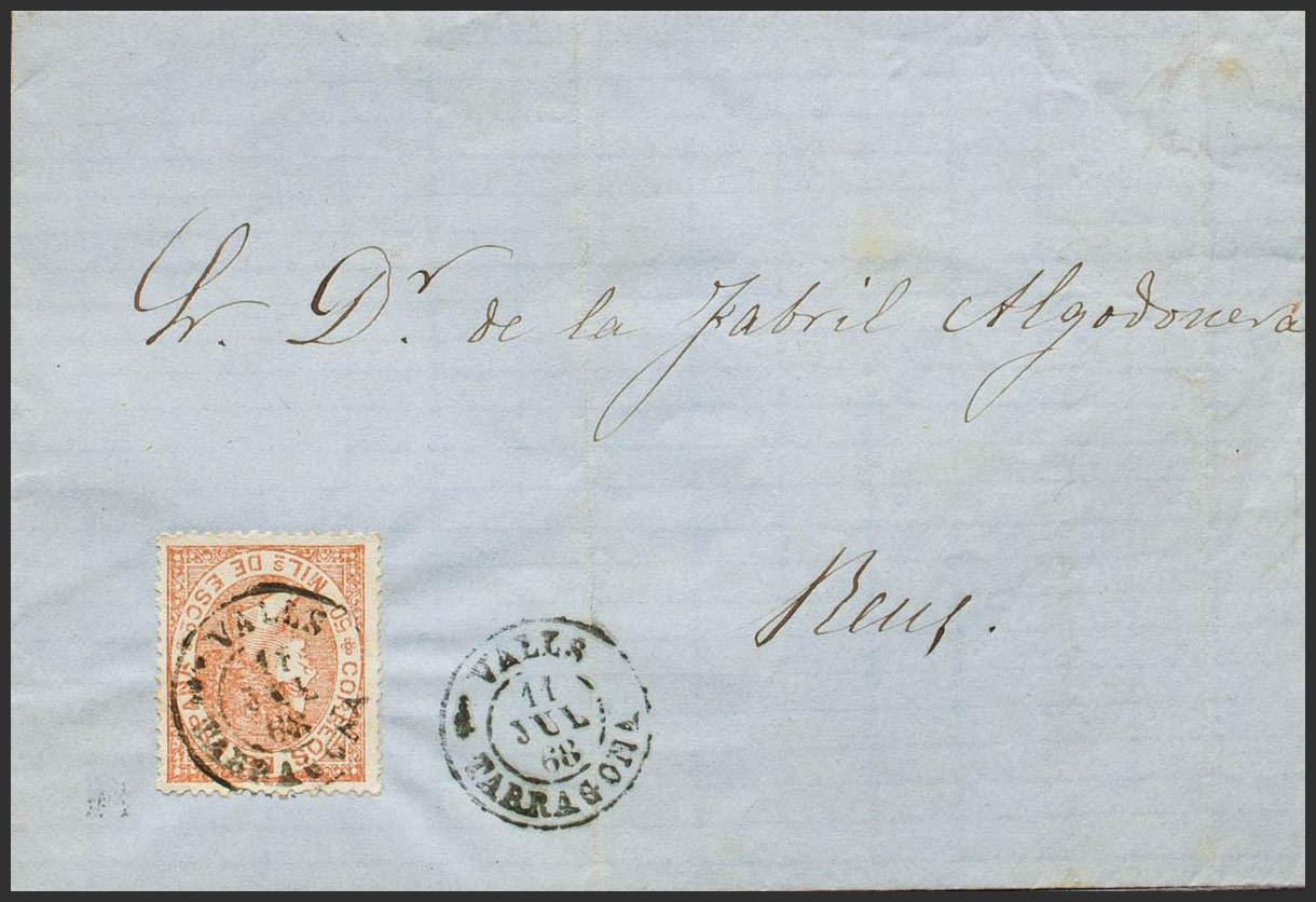 96. 1868. 50 mils castaño amarillo. VALLS a REUS. Matasello VALLS / TARRAGONA. MAGNIFICA. Ex-Tizón.