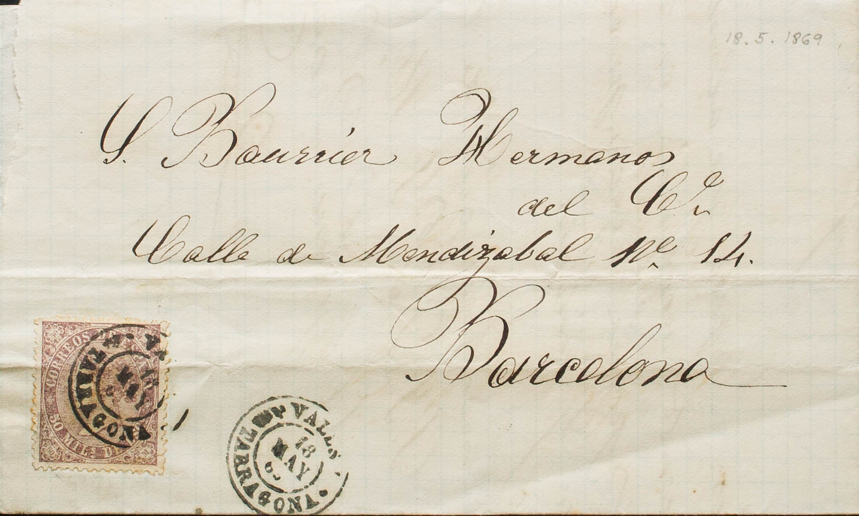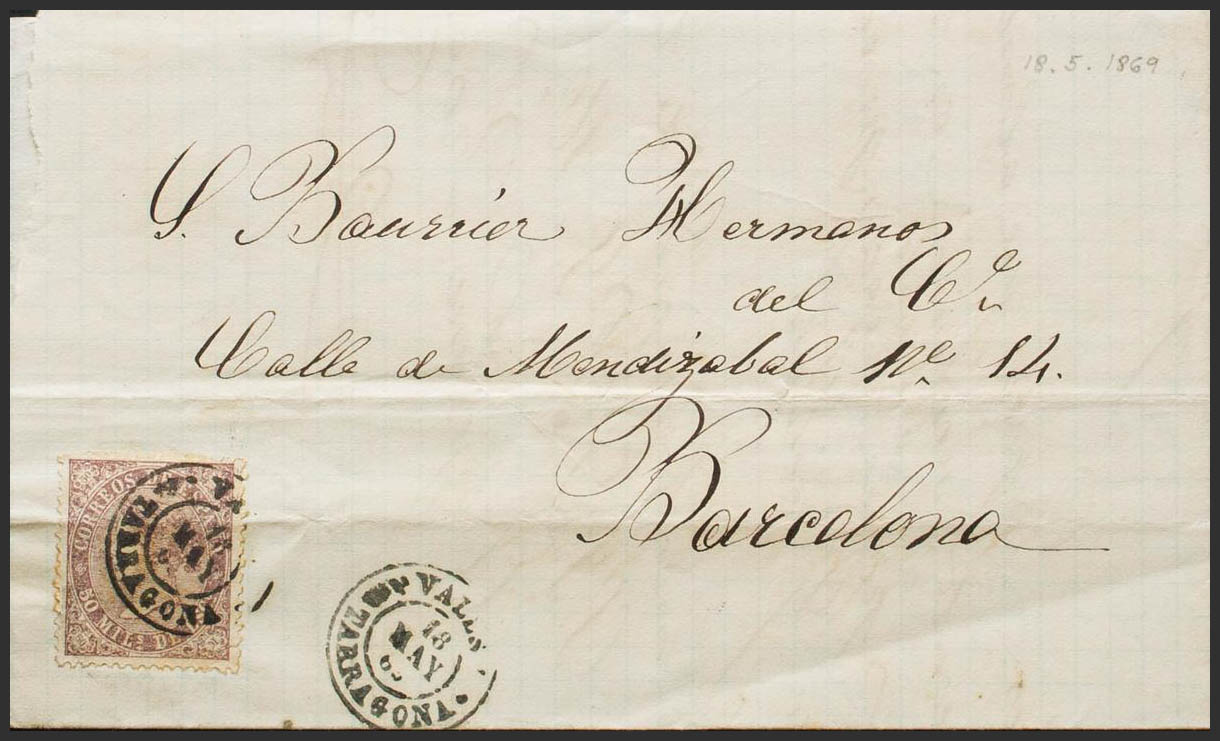 98. 1869. 50 mils violeta (doblez de archivo). VALLS a BARCELONA. Matasello VALLS / TARRAGONA. MAGNIFICA. Ex-Tizón.