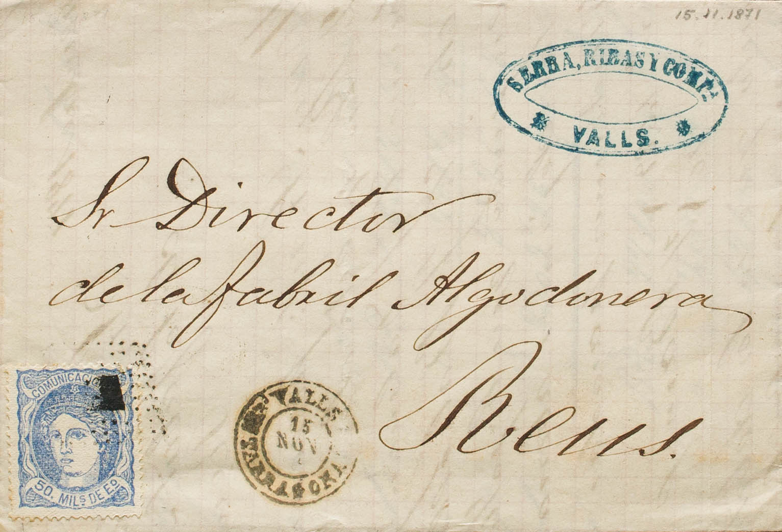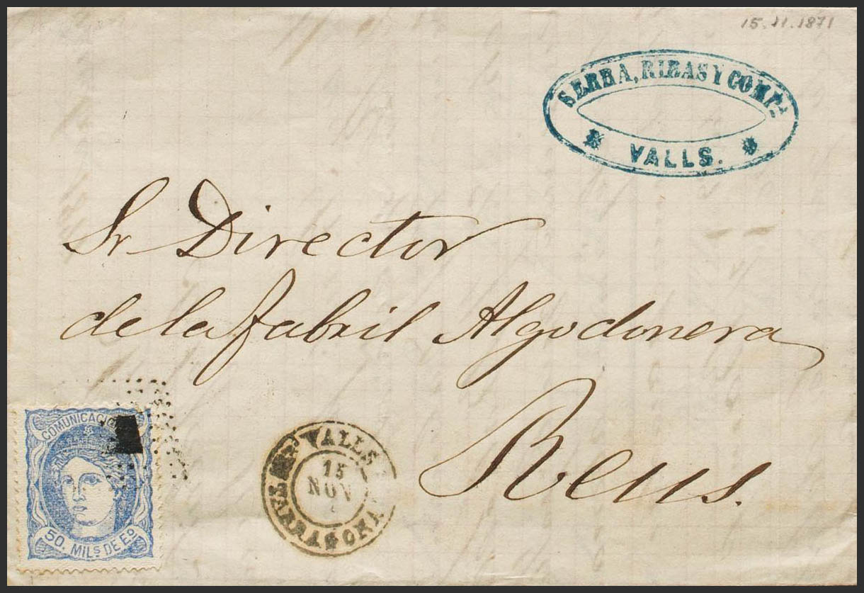 107. 1871. 50 mils ultramar. VALLS a REUS. En el frente fechador VALLS / TARRAGONA. MAGNIFICA. Ex-Tizón.