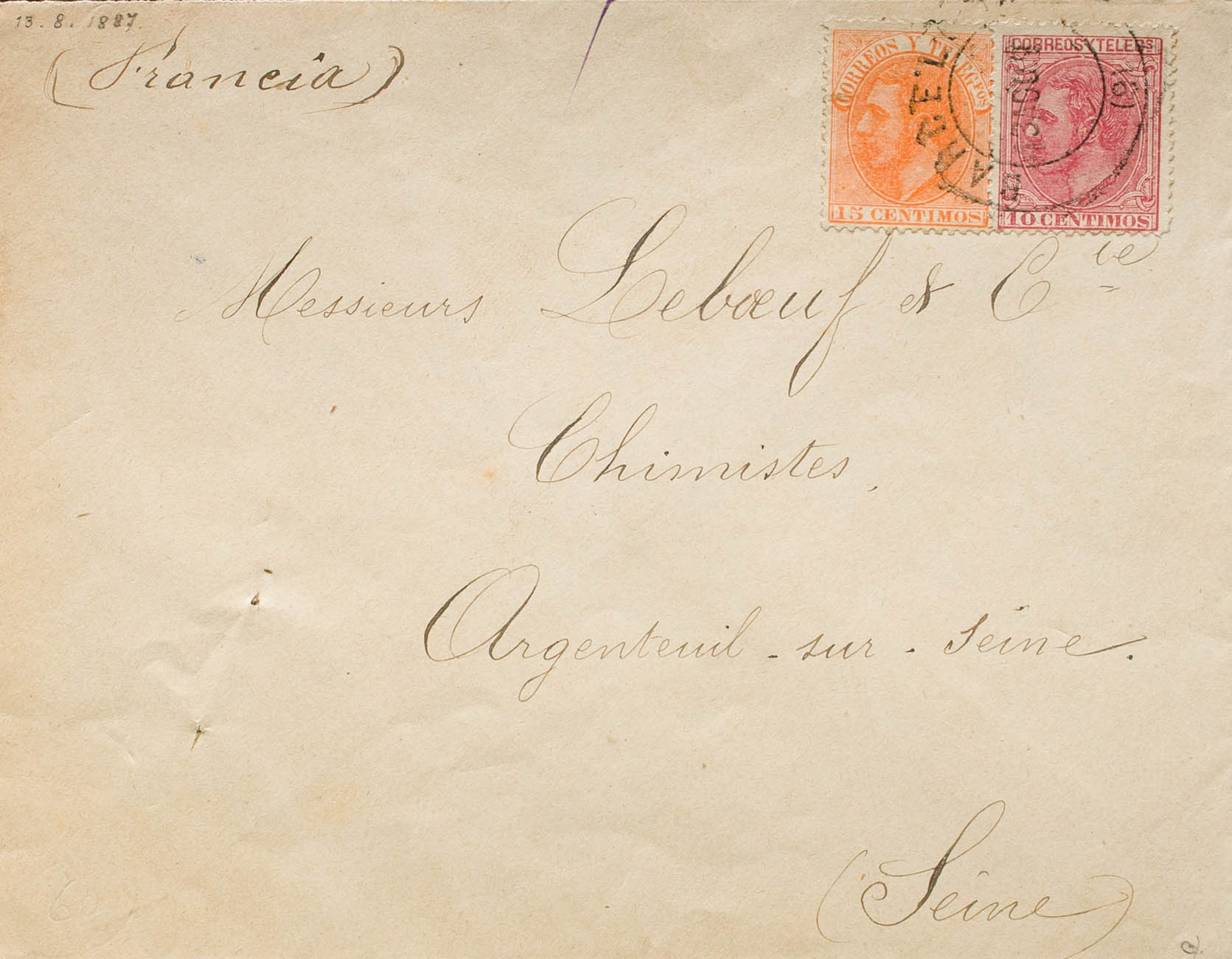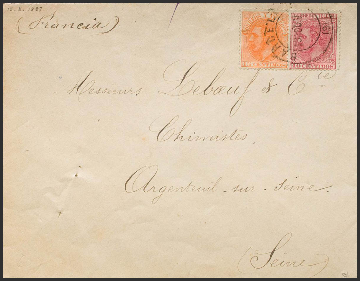 210, 202. 1887. 10 cts rosa y 15 cts naranja. BARCELONA a ARGENTEVIL SUR SEINE (FRANCIA). MAGNIFICA. Ex-Tizón.
