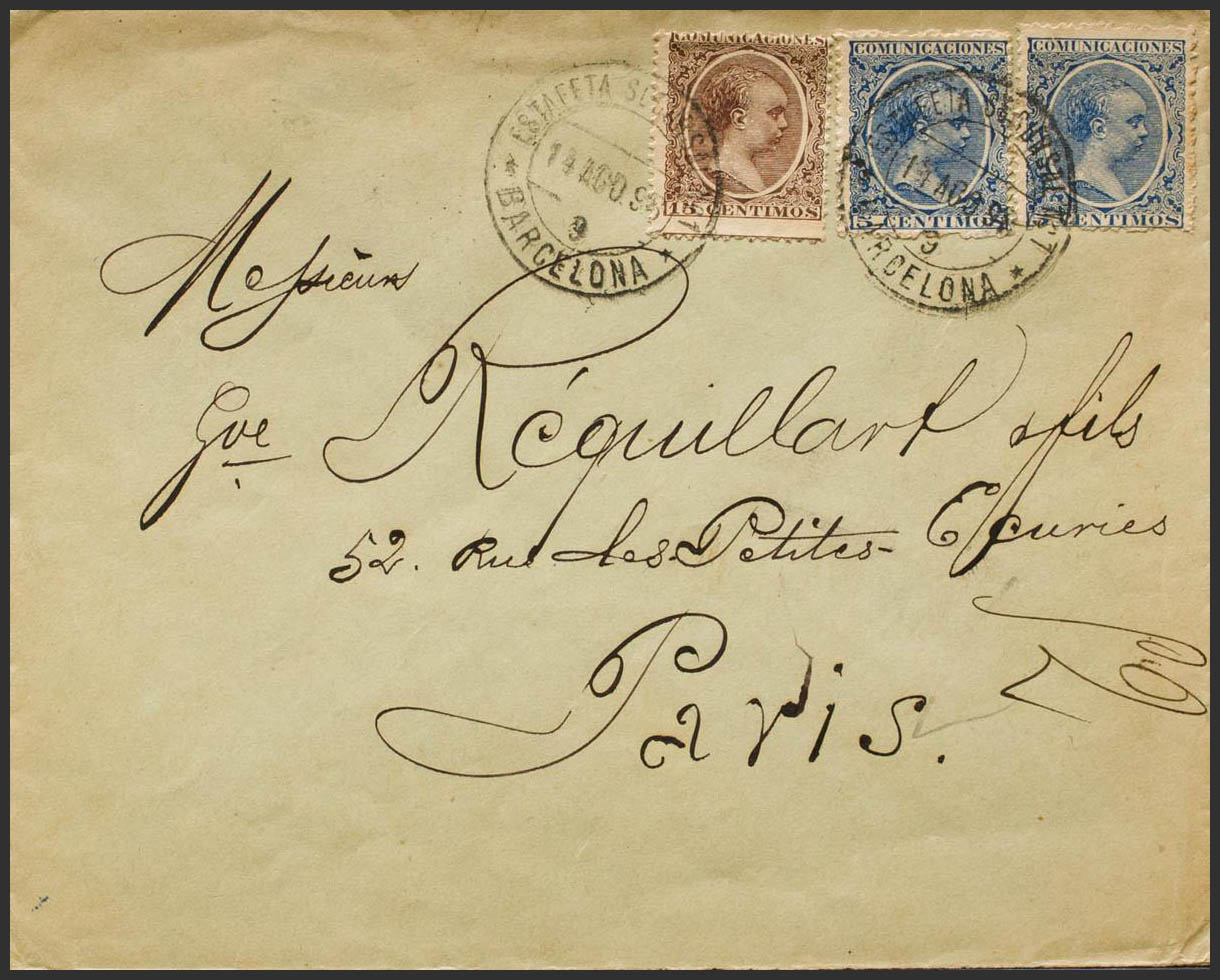 215(2), 219. 1896. 5 cts azul, dos sellos y 15 cts castaño violeta. BARCELONA a PARIS (FRANCIA). Matasello ESTAFETA DE CAMBIO / BARCELONA. MAGNIFICA. Ex-Tizón.