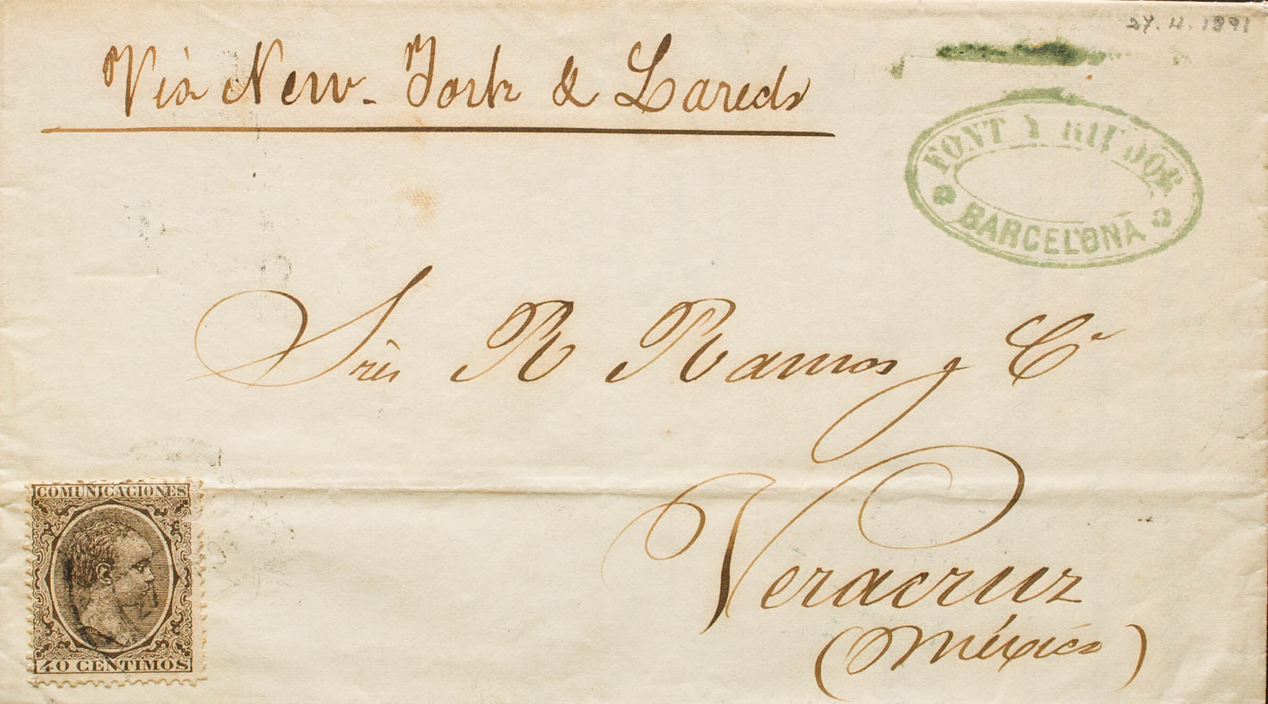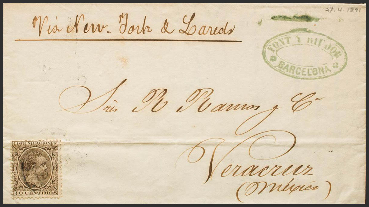 223. 1891. 40 cts castaño (doblez de archivo). BARCELONA a VERACRUZ (MEJICO). BONITA. Ex-Tizón.
