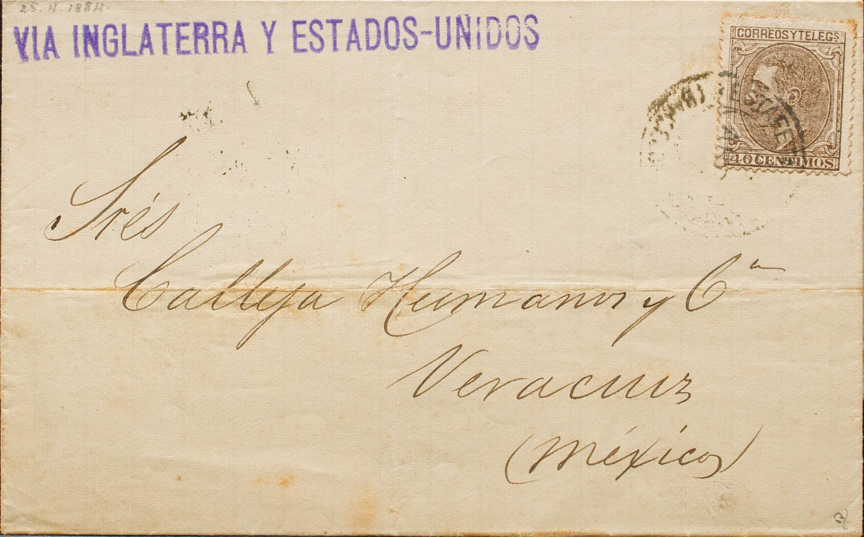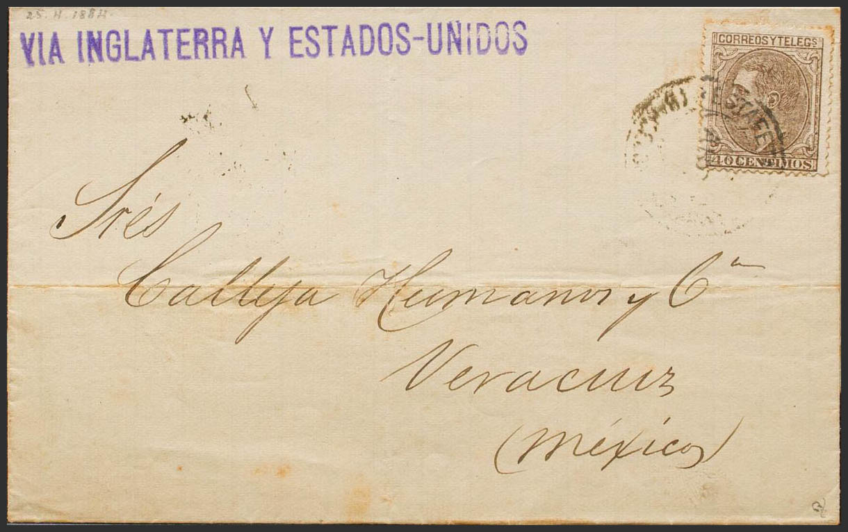 205. 1884. 40 cts castaño. BARCELONA a VERACRUZ (MEJICO). Matasello ESTAFETA DE CAMBIO / (BARCELONA). MAGNIFICA. Ex-Tizón.