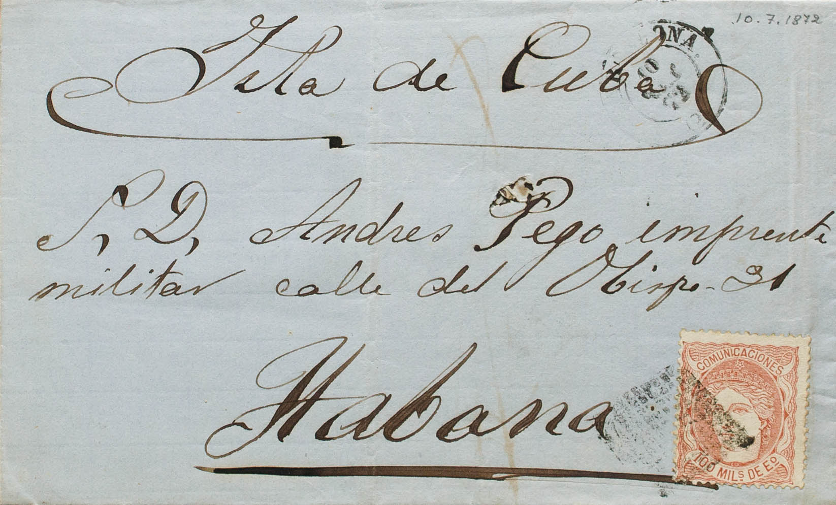 108. 1872. 100 mils castaño rojo. BARCELONA a LA HABANA. MAGNIFICA. Ex-Tizón.