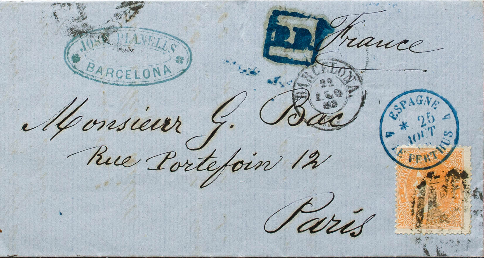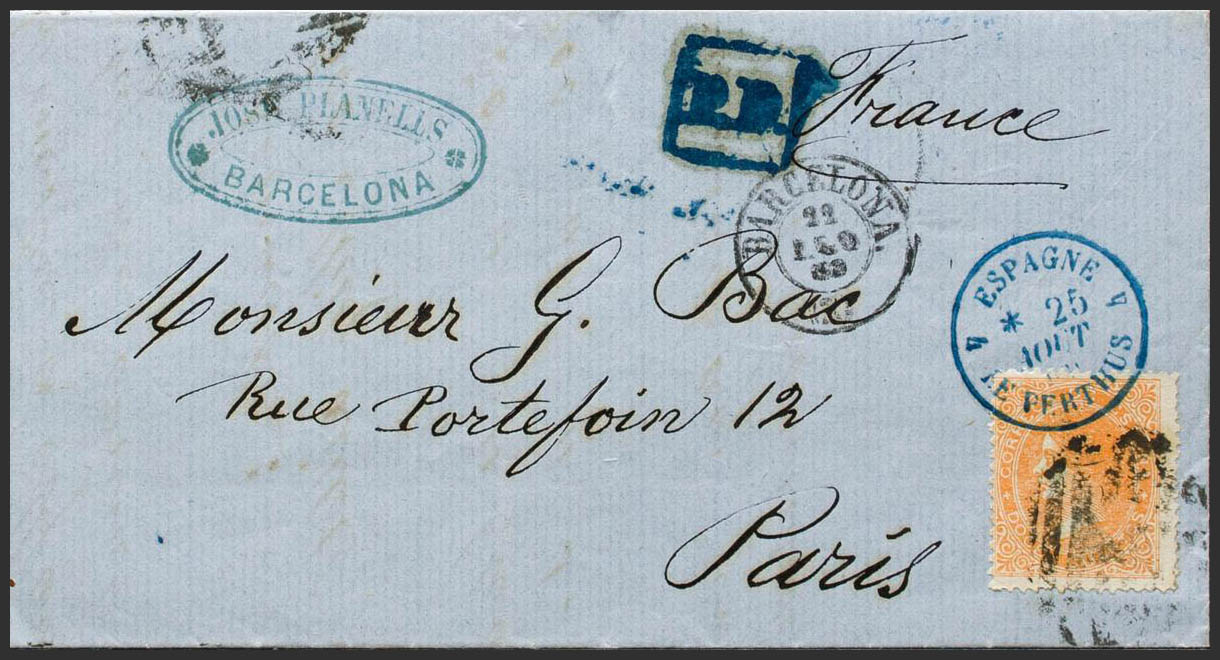 89A. 1869. 12 cuartos naranja. BARCELONA a PARIS (FRANCIA). Matasello PARRILLA CON Nº2 y fechador francés ESPAGNE / LE PERTUS, en azul. MAGNIFICA E INUSUAL. Ex-Tizón.