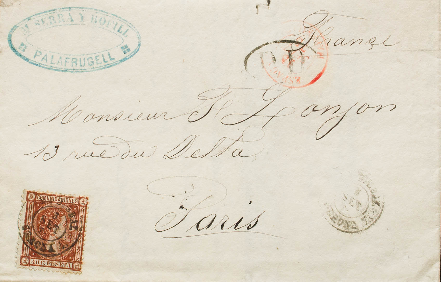 167. 1875. 40 cts castaño. PALAFRUGELL a PARIS (FRANCIA). Matasello LA BISBAL / GERONA. MAGNIFICA. Ex-Tizón.