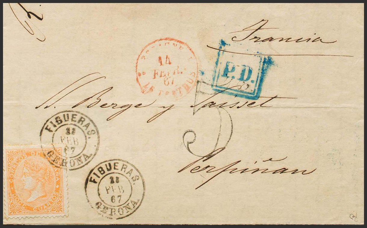 89. 1867. 12 cuartos amarillo. FIGUERAS a PERPIÑAN (FRANCIA). MAGNIFICA. Ex-Tizón.