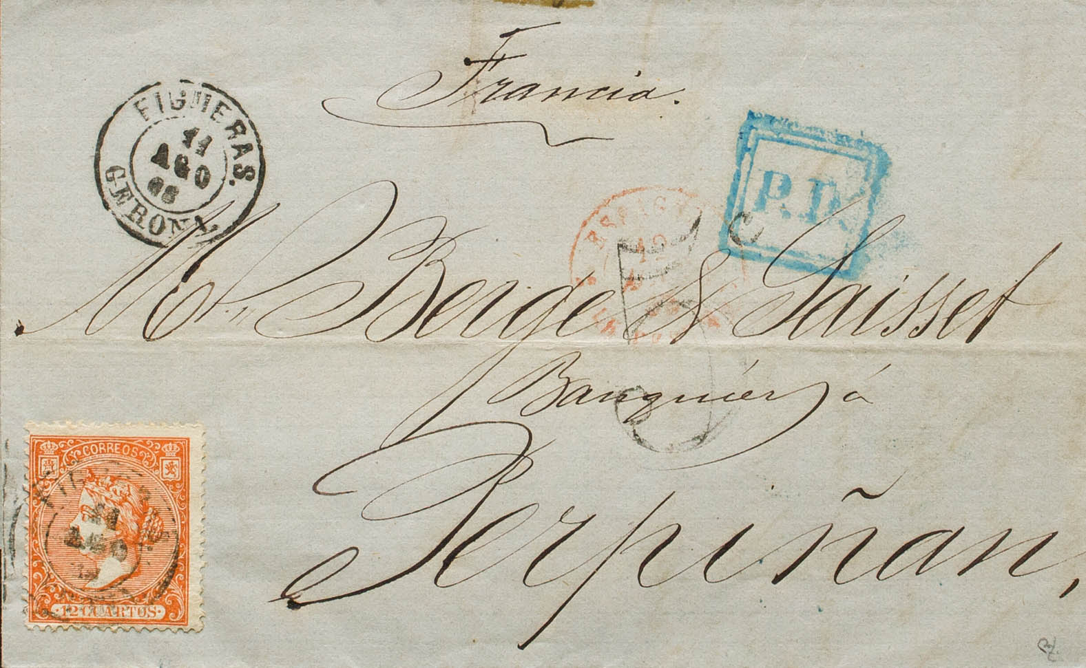 82. 1866. 12 cuartos naranja. FIGUERAS a TOULOUSE (FRANCIA). Matasello FIGUERAS / GERONA. MAGNIFICA. Ex-Tizón.