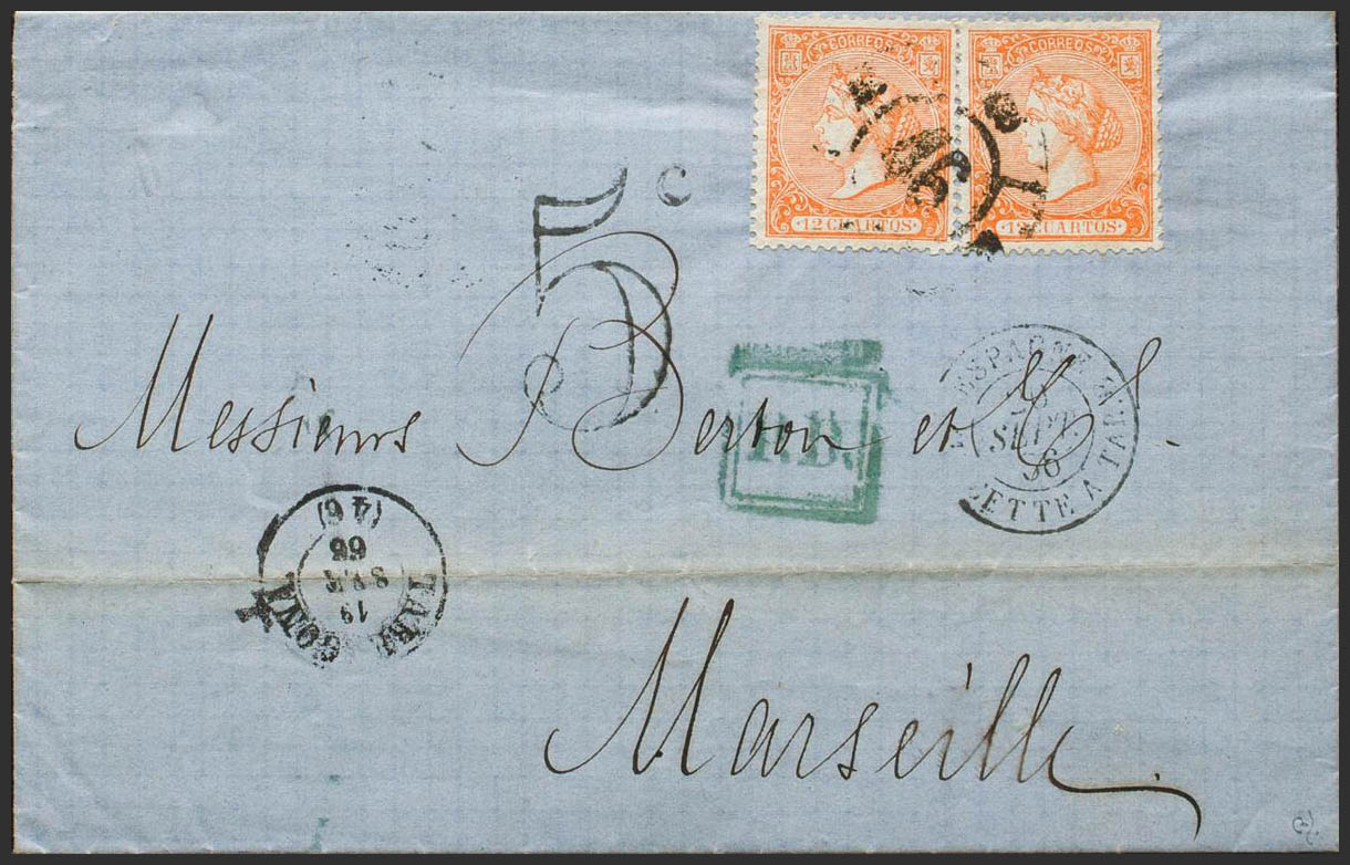 82(2). 1866. 12 cuartos naranja, dos sellos. TARRAGONA a MARSELLA (FRANCIA). Matasello R.CARRETA Nº46. MAGNIFICA. Ex-Tizón.
