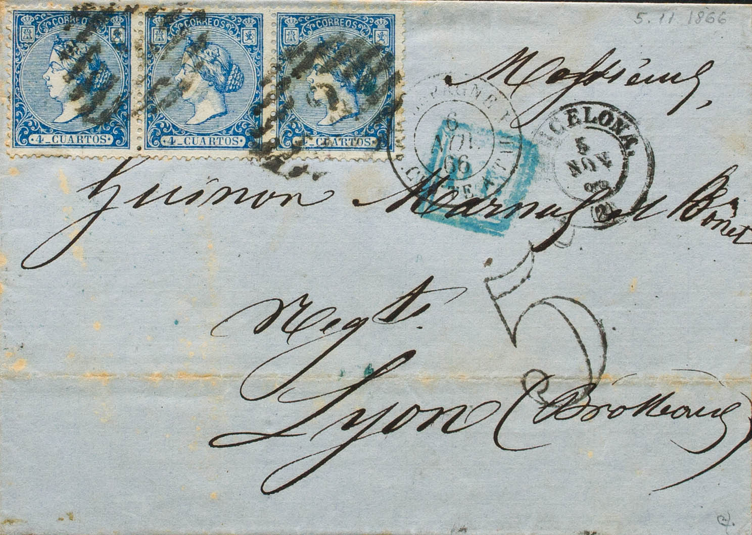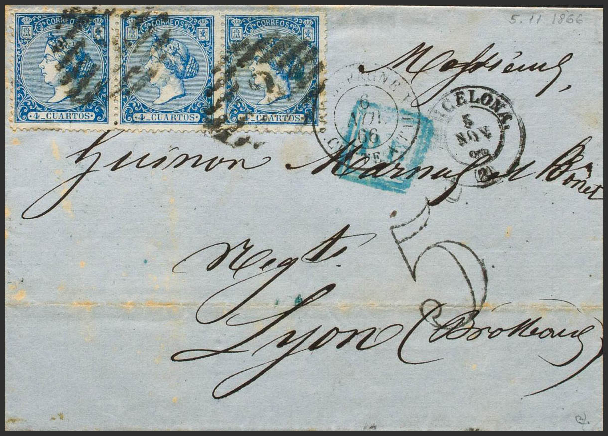 81(3). 1866. 4 cuartos azul, tira de tres. BARCELONA a LYON (FRANCIA). Matasello PARRILLA CON Nº2. MAGNIFICA. Ex-Tizón.