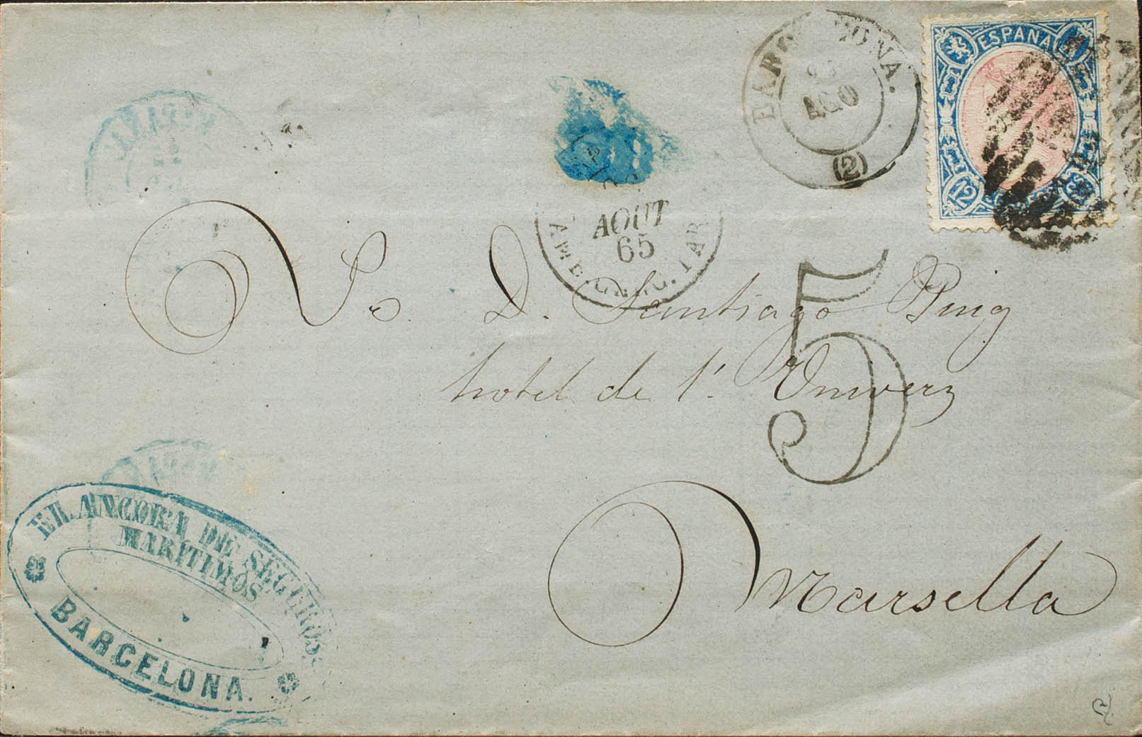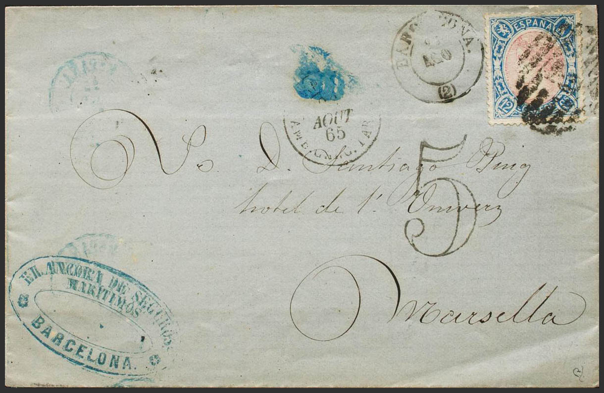 76. 1865. 12 cuartos azul y rosa. BARCELONA a MARSELLA (FRANCIA). Matasello PARRILLA CON Nº2. MAGNIFICA. Ex-Tizón.