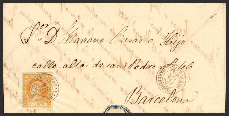 52. 1862. 4 cuartos amarillo. YGUALADA a BARCELONA. Matasello YGUALADA / BARCELONA. MAGNIFICA.