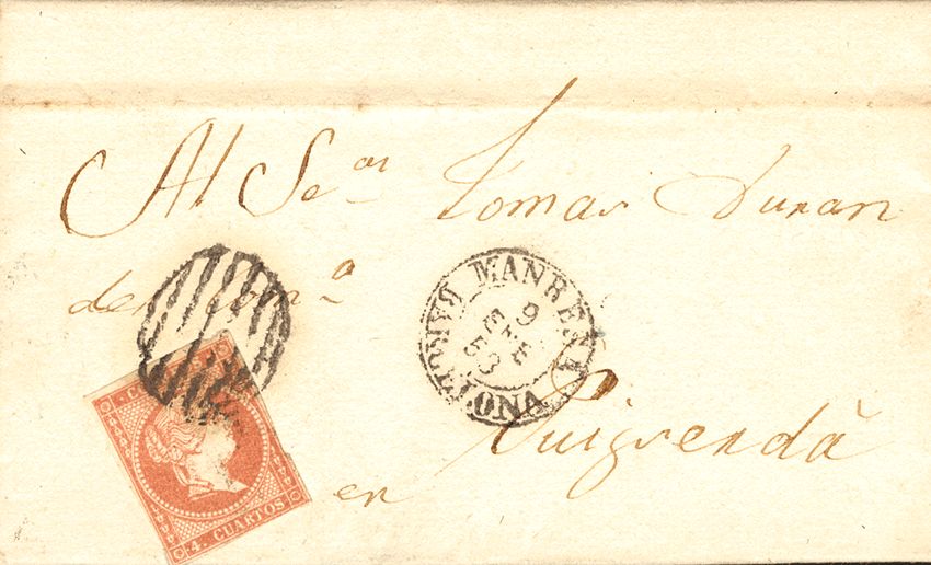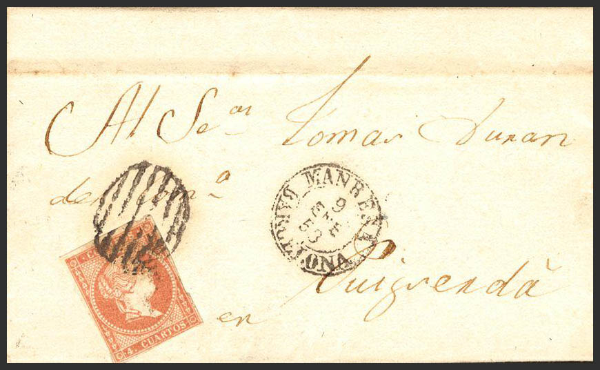 48. 1858. 4 cuartos rojo. MANRESA a PUIGCERDA. Matasello PARRILLA, al lado MANRESA / BARCELONA (Tipo I).