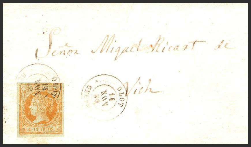 52. 1860. 4 cuartos amarillo. OLOT a VICH. Matasello OLOT / GERONA.