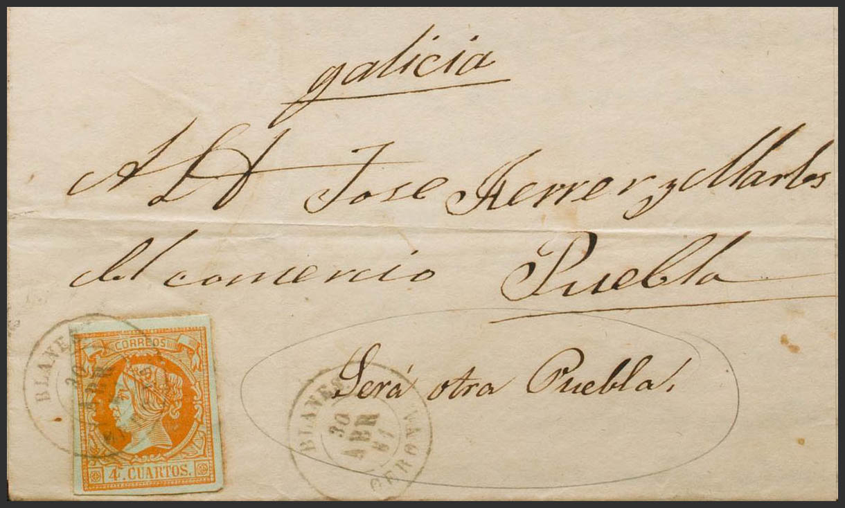 52. 1861. 4 cuartos naranja. BLANES a PUEBLA DEL CARAMIÑAL. Matasello BLANES / GERONA y en el frente indicación manuscrita del cartero "Será otra Puebla", quizás por haber sido entregada en la Puebla del Brollon (tránsito de Lugo al dorso). MAGNIFICA Y RARA.