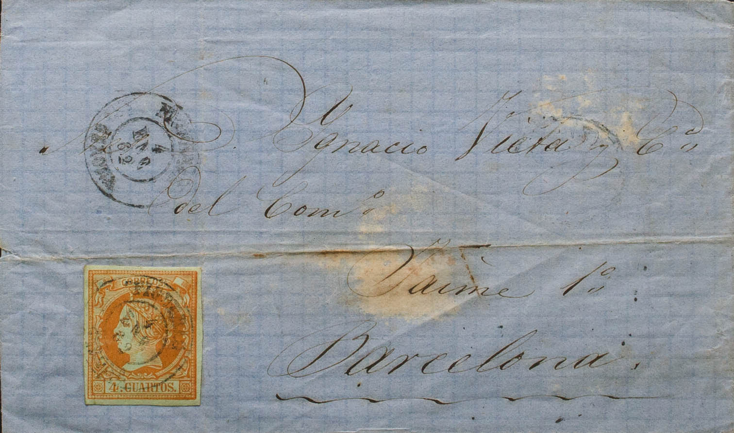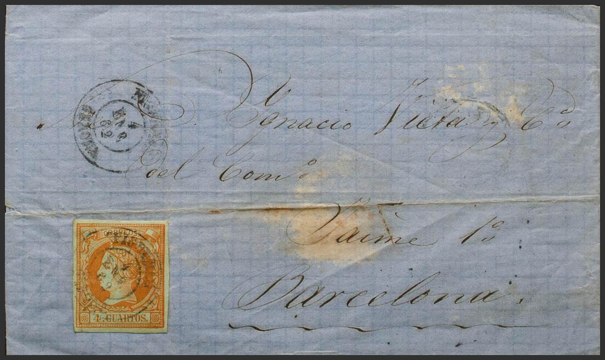 52. 1862. 4 cuartos naranja. FIGUERAS a BARCELONA. Matasello FIGUERAS / GERONA. MAGNIFICA.