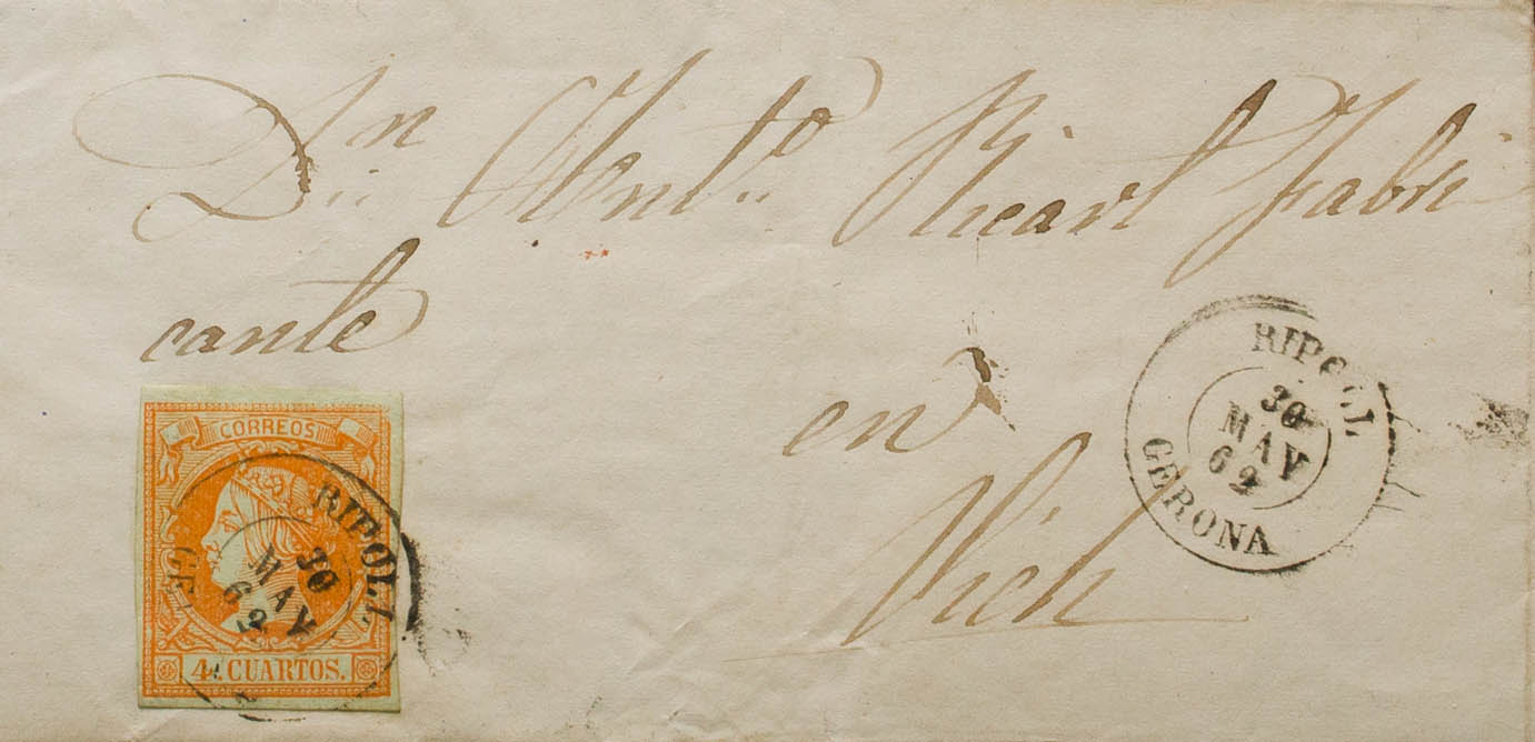 52. 1862. 4 cuartos naranja. PUEBLA DE LILLET a VICH. Matasello RIPOLL / GERONA. MAGNIFICA.