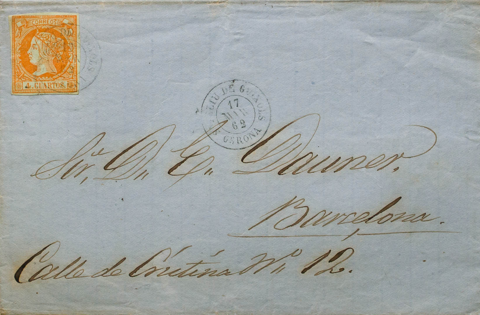 52. 1862. 4 cuartos naranja. SAN FELIU DE GUIXOLS a BARCELONA. MAtasello SN. FELIU DE GUIXOLS / GERONA. MAGNIFICA.