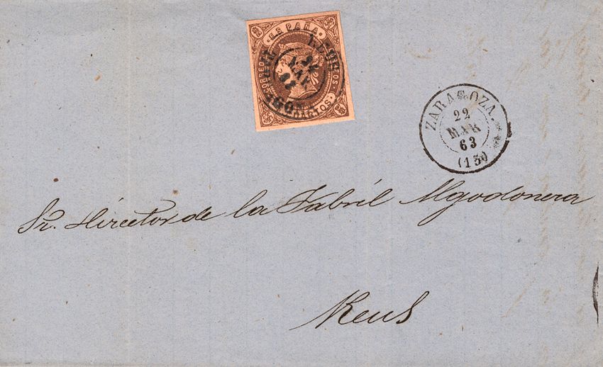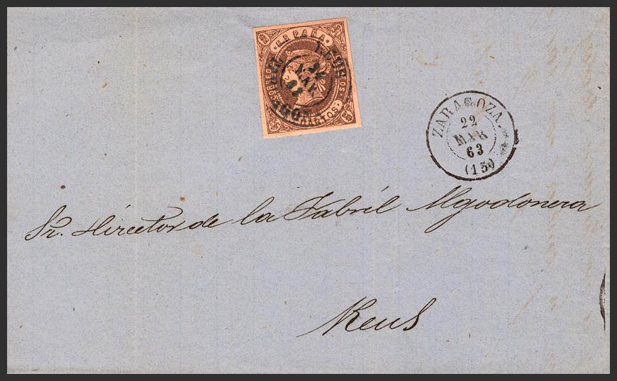 52. 1863. 4 cuartos castaño. ZARAGOZA a REUS. Matasello REUS / TARRAGONA, a la llegada. MAGNIFICA.