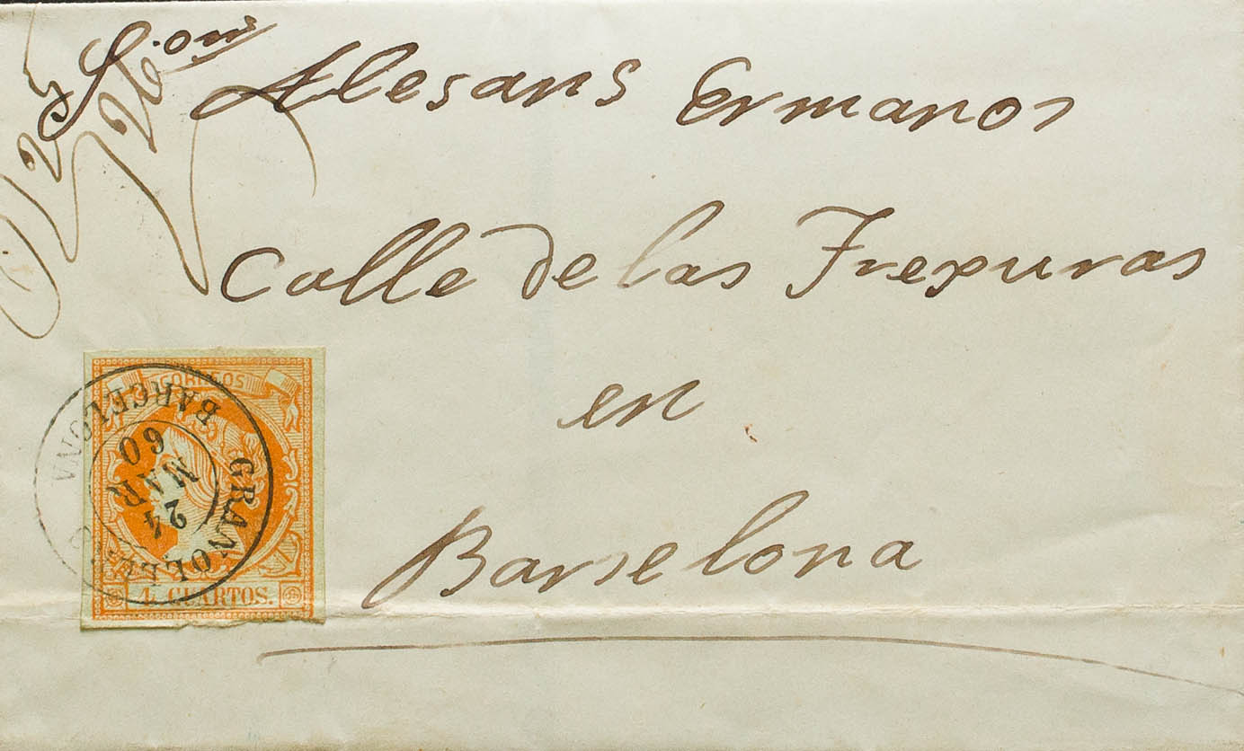 52. 1860. 4 cuartos naranja. GRANOLLERS a BARCELONA. Matasello GRANOLLERS / BARCELONA. MAGNIFICA.