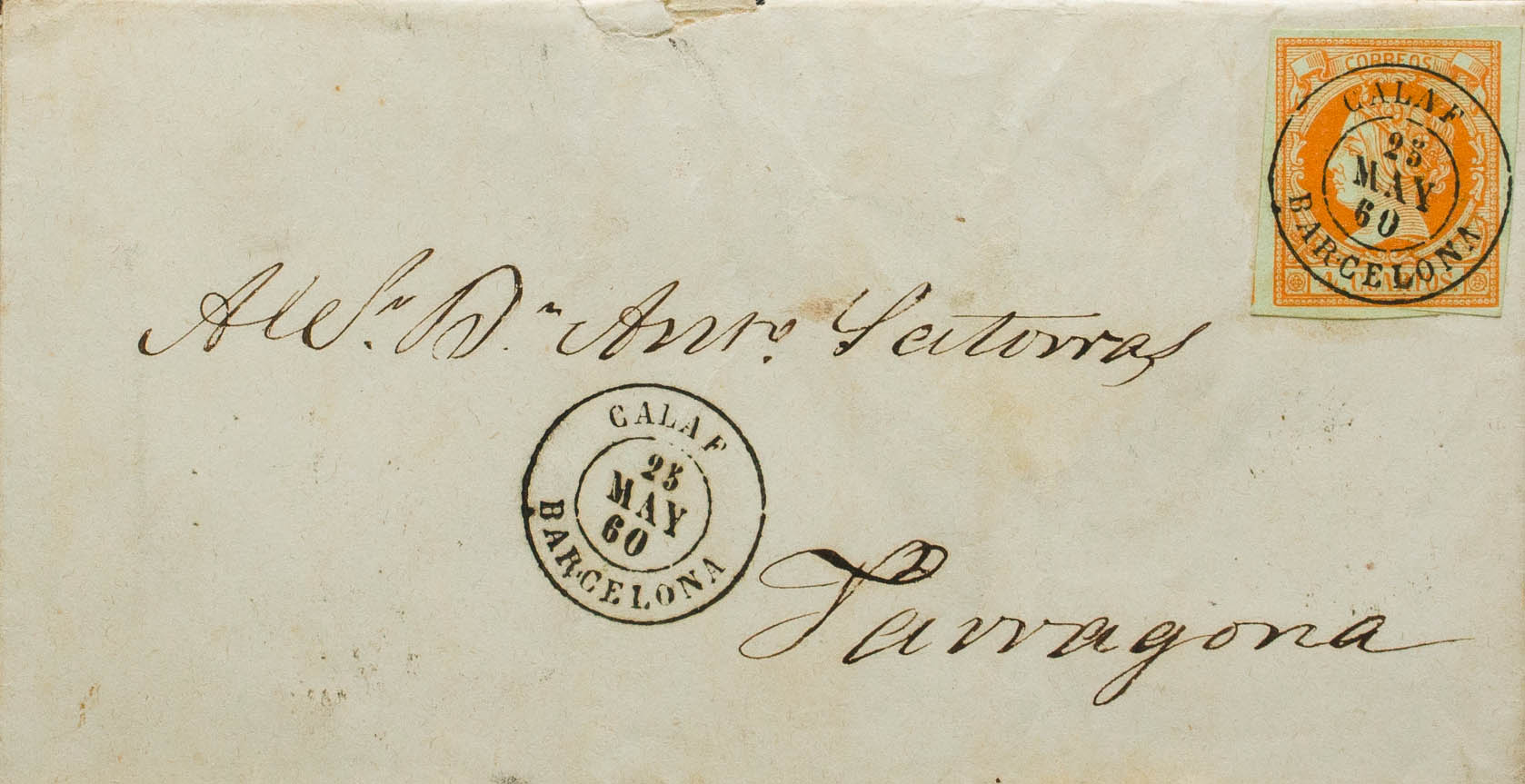 52. 1860. 4 cuartos naranja. CALAF a TARRAGONA. Matasello CALAF / BARCELONA. MAGNIFICA Y RARA.