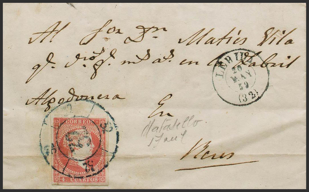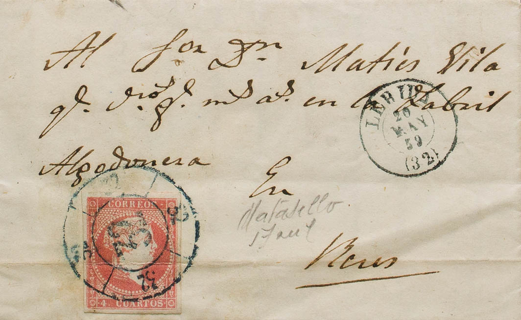48. 1859. 4 cuartos rojo. LERIDA a REUS. Matasello R.CARRETA Nº32, en azul. MAGNIFICA Y RARA.