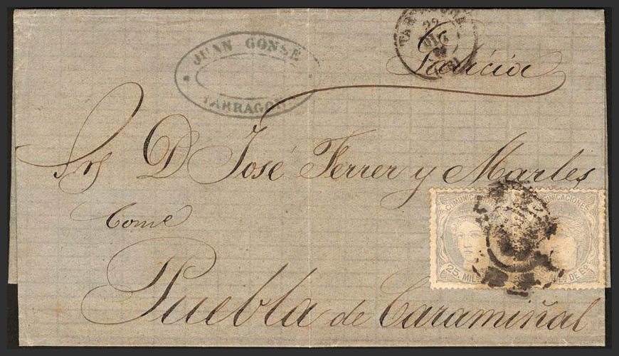 106(2). 1870. 25 mil lila, pareja. TARRAGONA a PUEBLA. Matasello R. CARRETA Nº 46, modificada de Tarragona. RARA COMPOSICION PARA COMPLETAR LA TARIFA DE 50 MIL.