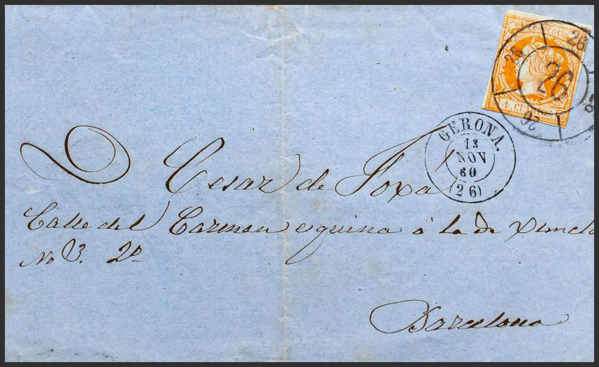 52. 1860. 4 cuartos amarillo. GERONA a BARCELONA. Matasello R.CARRETA Nº26, de Gerona. MAGNIFICA Y ESPECTACULAR.