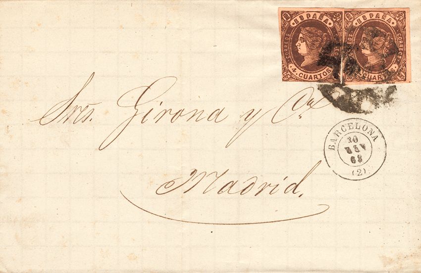 58(2). 1863. 4 cuartos castaño, dos sellos. BARCELONA a MADRID. Matasello R.CARRETA Nº2. BONITA.