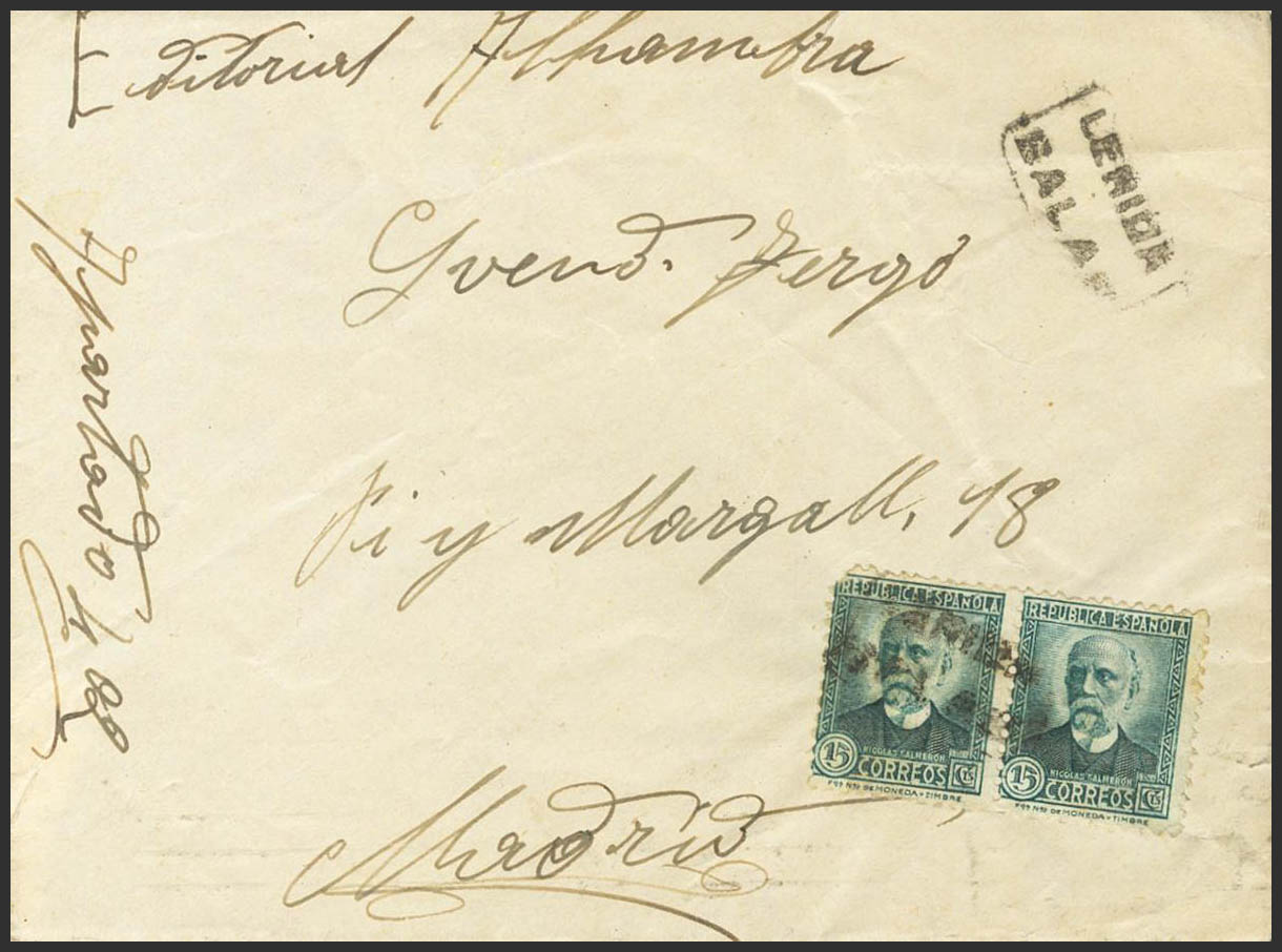 665(2). 1932. 15 cts verde, dos sellos. SALAS a MADRID. Matasello carterÃa LERIDA / SALAS y al dorso llegada. BONITA Y RARA.