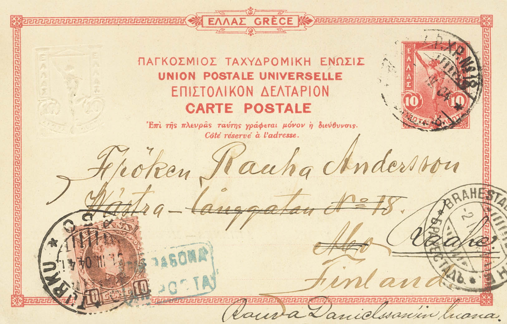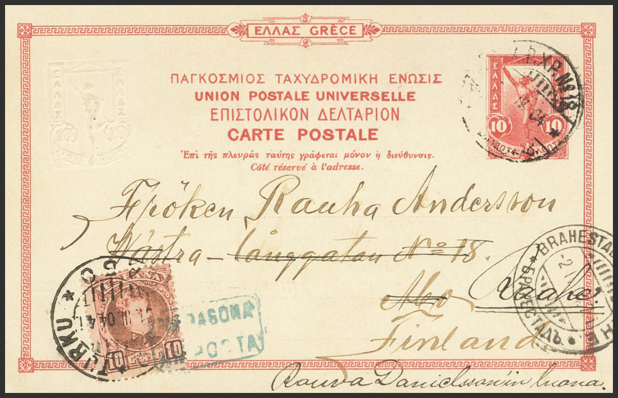 243. 1904. 10 cts rojo sobre Tarjeta Entero Postal de Grecia de SAN CARLOS DE LA RAPITA (TARRAGONA) a ABO (FINLANDIA), y reexpedida a RAAHE. Matasello carterÃa TARRAGONA / AMPOSTA, en azul y fechador de llegada ABO TURKU / ABO, en el frente llegada BRAHESTADT / RAAHE, en caracteres cirÃlicos (el entero está precancelado en Grecia). MAGNIFICA Y RARISIMA.