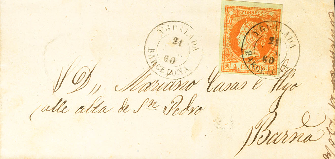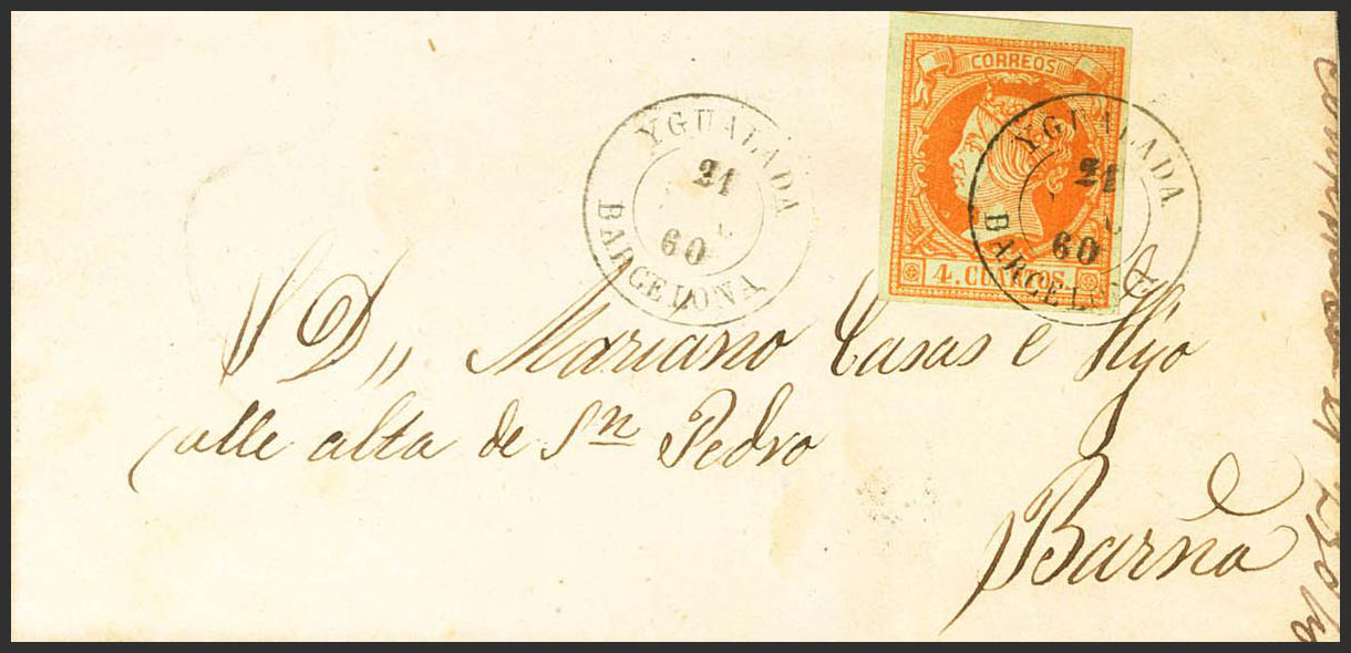 52. 1860. 4 cuartos amarillo. IGUALADA a BARCELONA. Matasello YGUALADA / BARCELONA. MAGNIFICA.