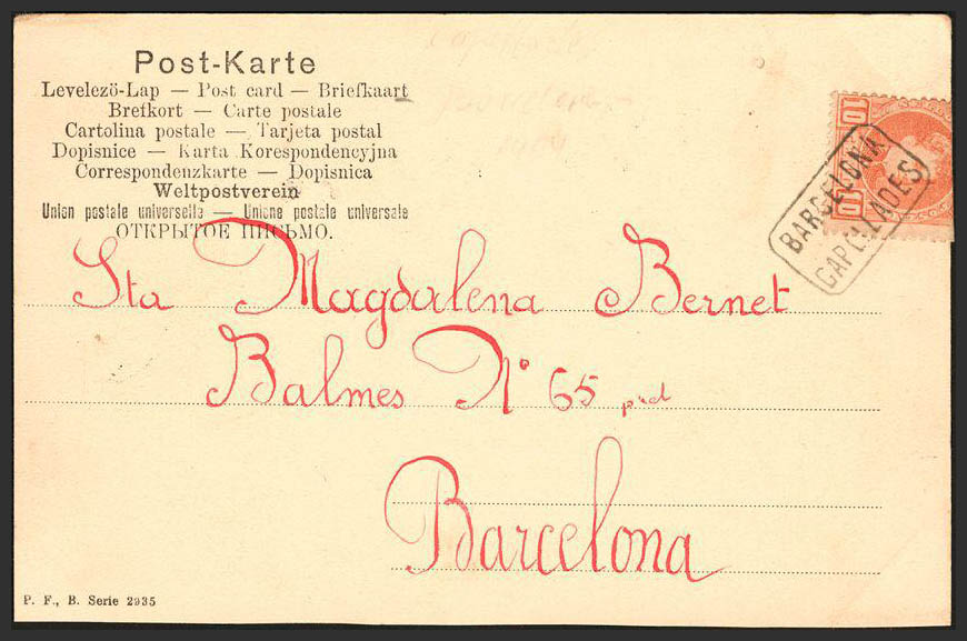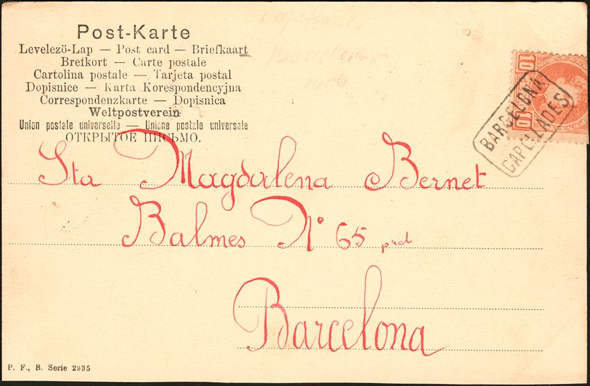 243. 1903. 10 cts. rojo. Tarjeta Postal de CAPELLADES a BARCELONA. Matasello carterÃa BARCELONA / CAPELLADES. MAGNIFICA.