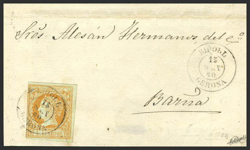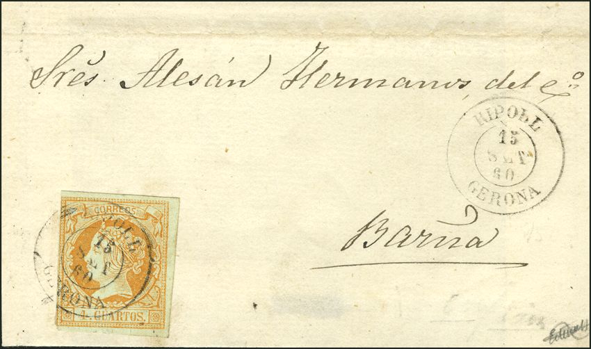 52. 1860. 4 cuartos amarillo. RIPOLL a BARCELONA. Matasello RIPOLL / GERONA. MAGNIFICA.