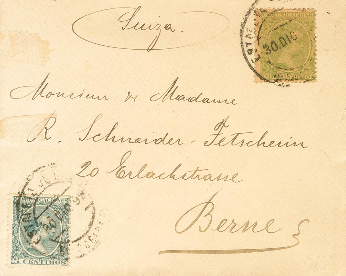 216, 220. 1899. 5 cts verde gris y 20 cts verde amarillo. BARCELONA a BERNA (SUIZA). Matasello ESTAFETA DE CAMBIO / BARCELONA, al dorso llegada. MAGNIFICA.