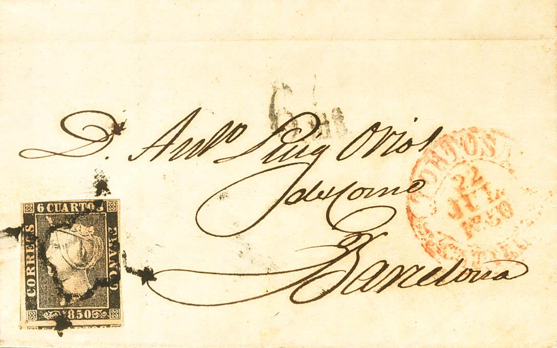 1. 1850. 6 cuartos negro. TORTOSA a BARCELONA. En el frente baeza TORTOSA / CATALUÑA. MAGNIFICA.