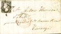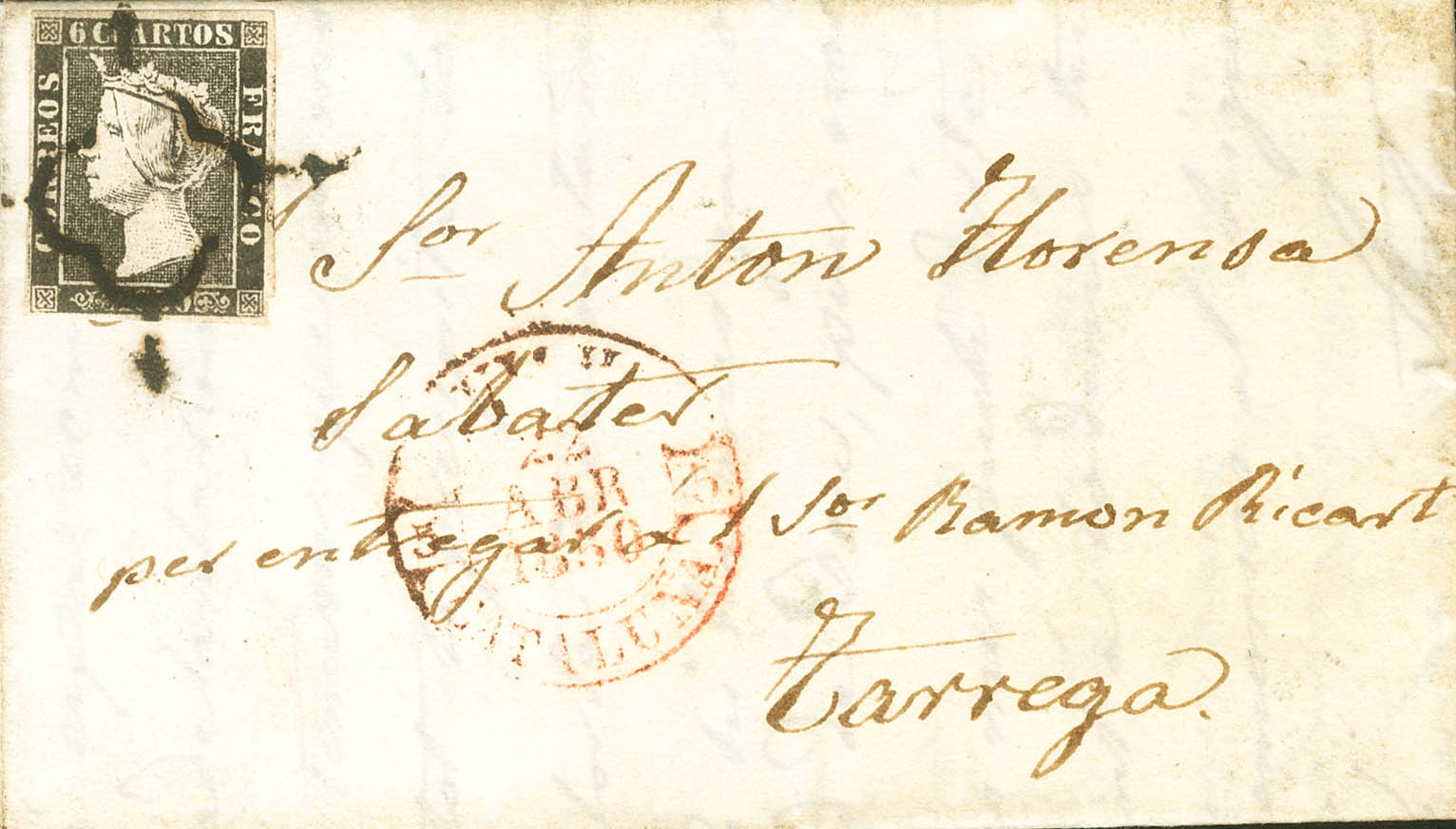 1. 1850. 6 cuartos negro. VICH a TARREGA. En el frente baeza VICH / CATALUÑA, en rojo. MAGNIFICA.