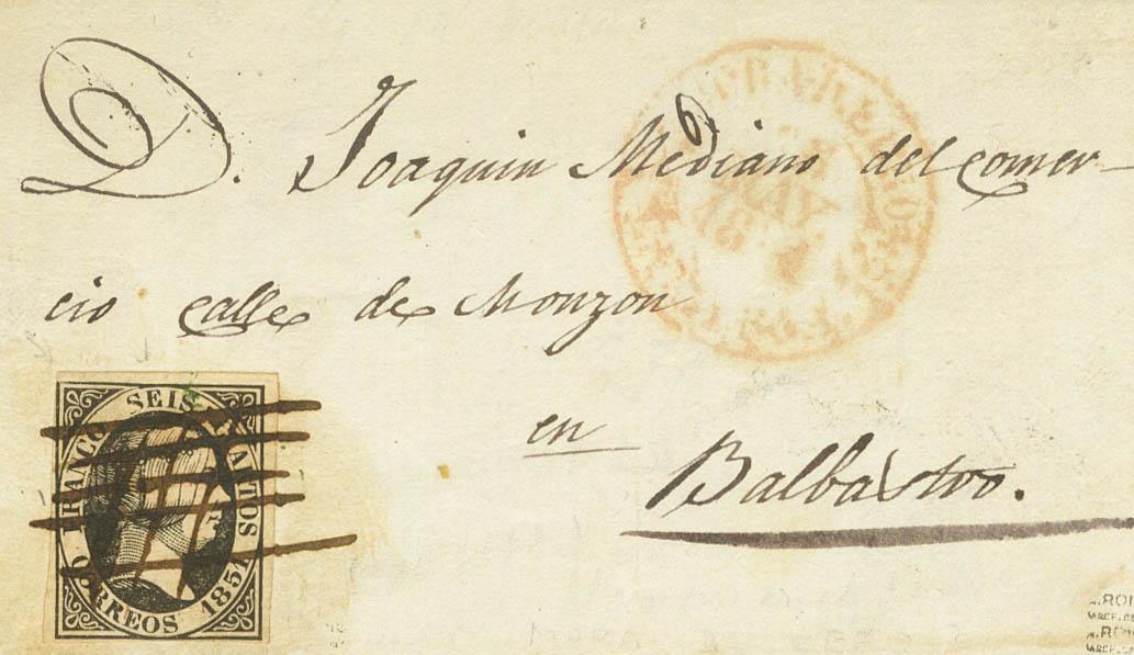 6. 1851. 6 cuartos negro. Frontal de MORA DE EBRO (TARRAGONA) a BARBASTRO (HUESCA). Matasello RAYAS DE TINTA (imitando una "Parrilla"), en tinta de escribir. MAGNIFICO Y MUY RARO.