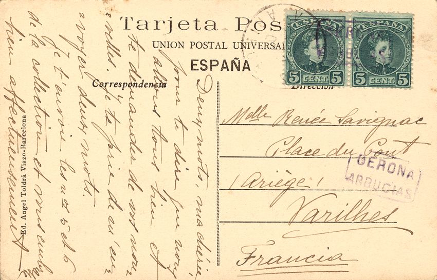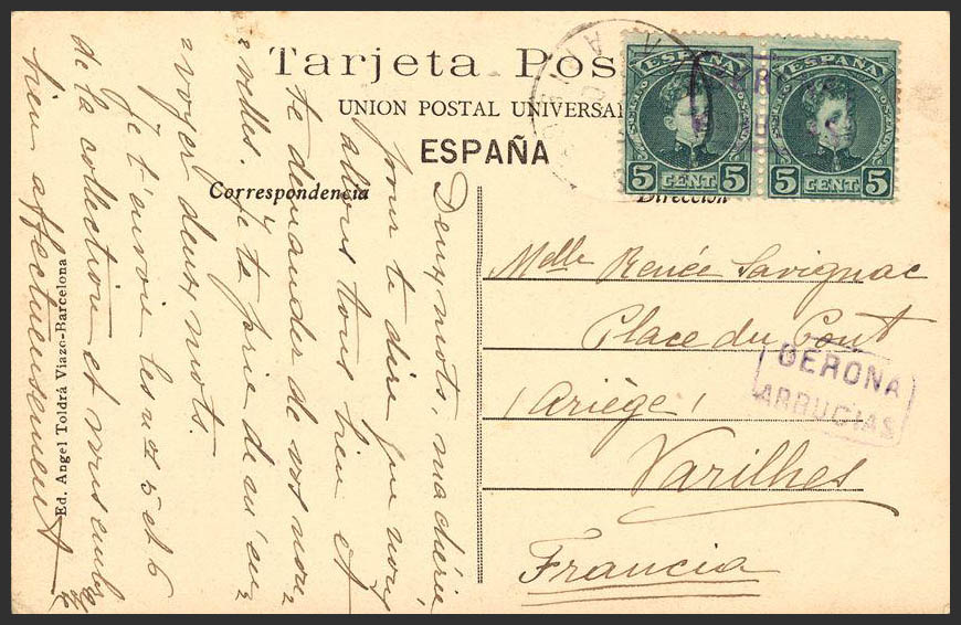 242(2). (1905ca). 5 cts verde, pareja. Tarjeta Postal de ARBUCIAS a VARILHES (FRANCIA). Matasello carterÃa GERONA / ARBUCIAS, en violeta. MAGNIFICA.
