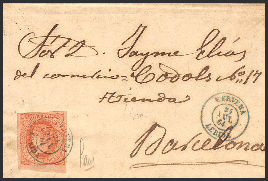 64. 1864. 4 cuartos salmón. CERVERA a BARCELONA. Matasello CERVERA / LERIDA, en azul. MAGNIFICO.