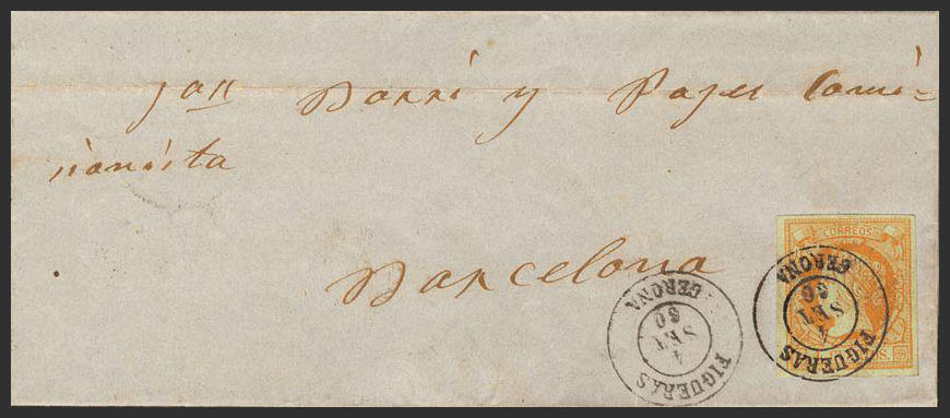 52. 1860. 4 cuartos amarillo. FIGUERAS a BARCELONA. Matasello FIGUERAS / GERONA. MAGNIFICA.