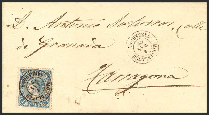 75. 1865. 4 cuartos azul. MONTBLANCH a TARRAGONA. Matasello MONTBLANCH / TARRAGONA. MAGNIFICA.
