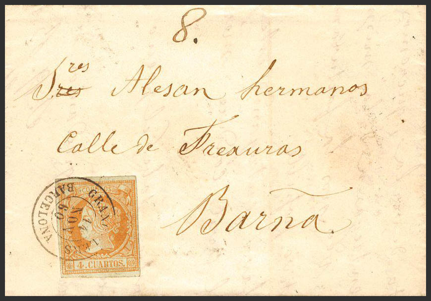 52. 1860. 4 cuartos naranja. GRANOLLERS a BARCELONA. Matasello GRANOLLERS / BARCELONA. MAGNIFICO.