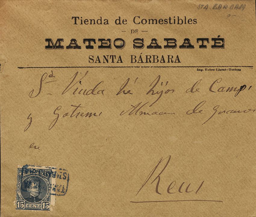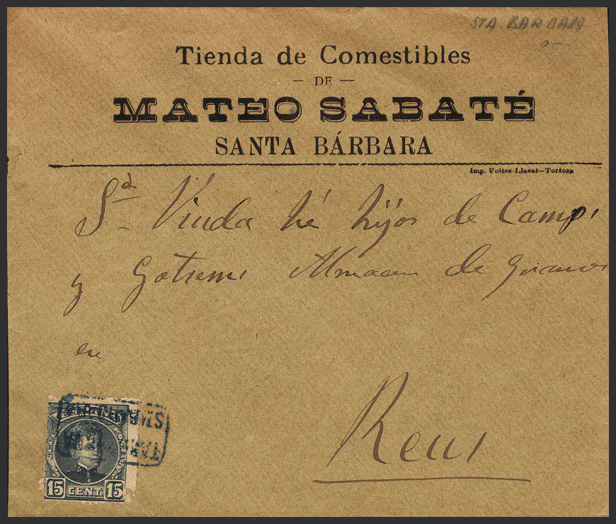 244. 1901. 15 cts azul negruzco. SANTA BARBARA a REUS. Matasello carterÃa TARRAGONA / SANTA BARBARA, en azul. MAGNIFICA.