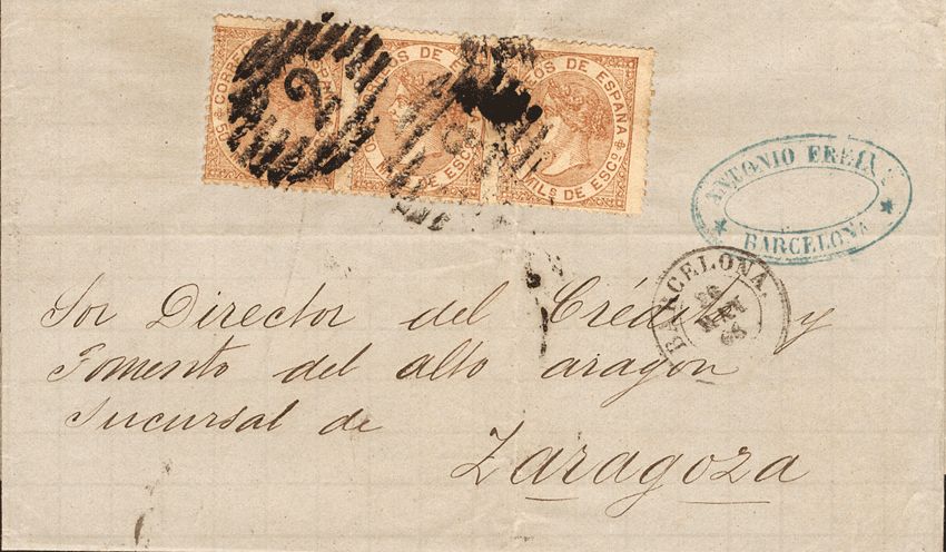 96(3). 1868. 50 mils castaño, tres sellos. BARCELONA a ZARAGOZA. Triple porte. MAGNIFICA.