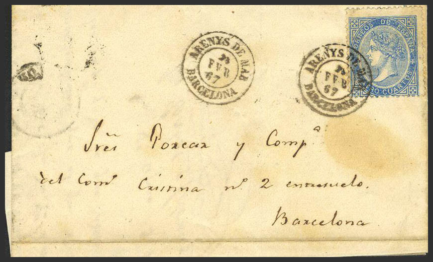 88. 1867. 4 cuartos azul. ARENYS a BARCELONA. Matasello ARENYS DE MAR / BARCELONA. MAGNIFICA.