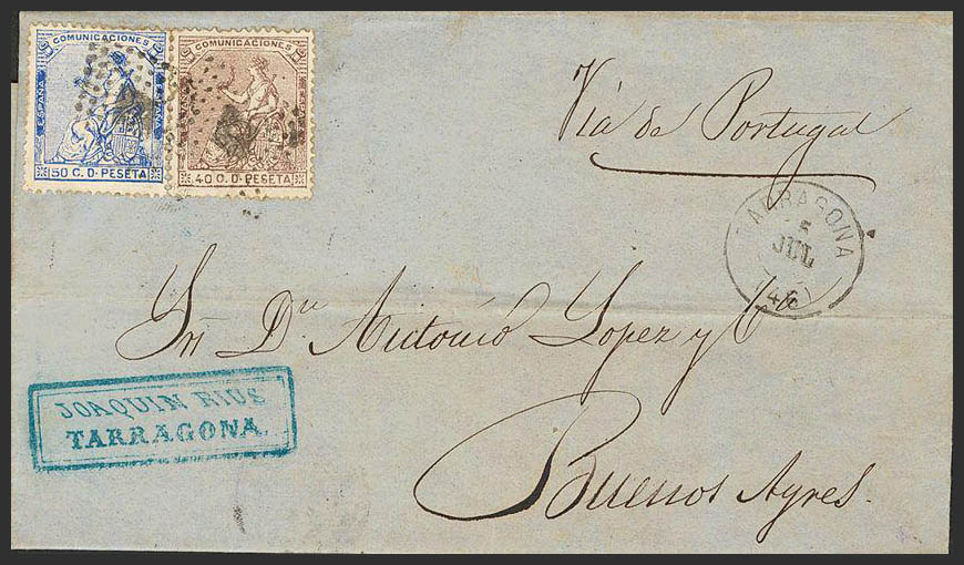 136, 137. 1873. 40 cts castaño y 50 cts azul. TARRAGONA a BUENOS AIRES. MAGNIFICA.